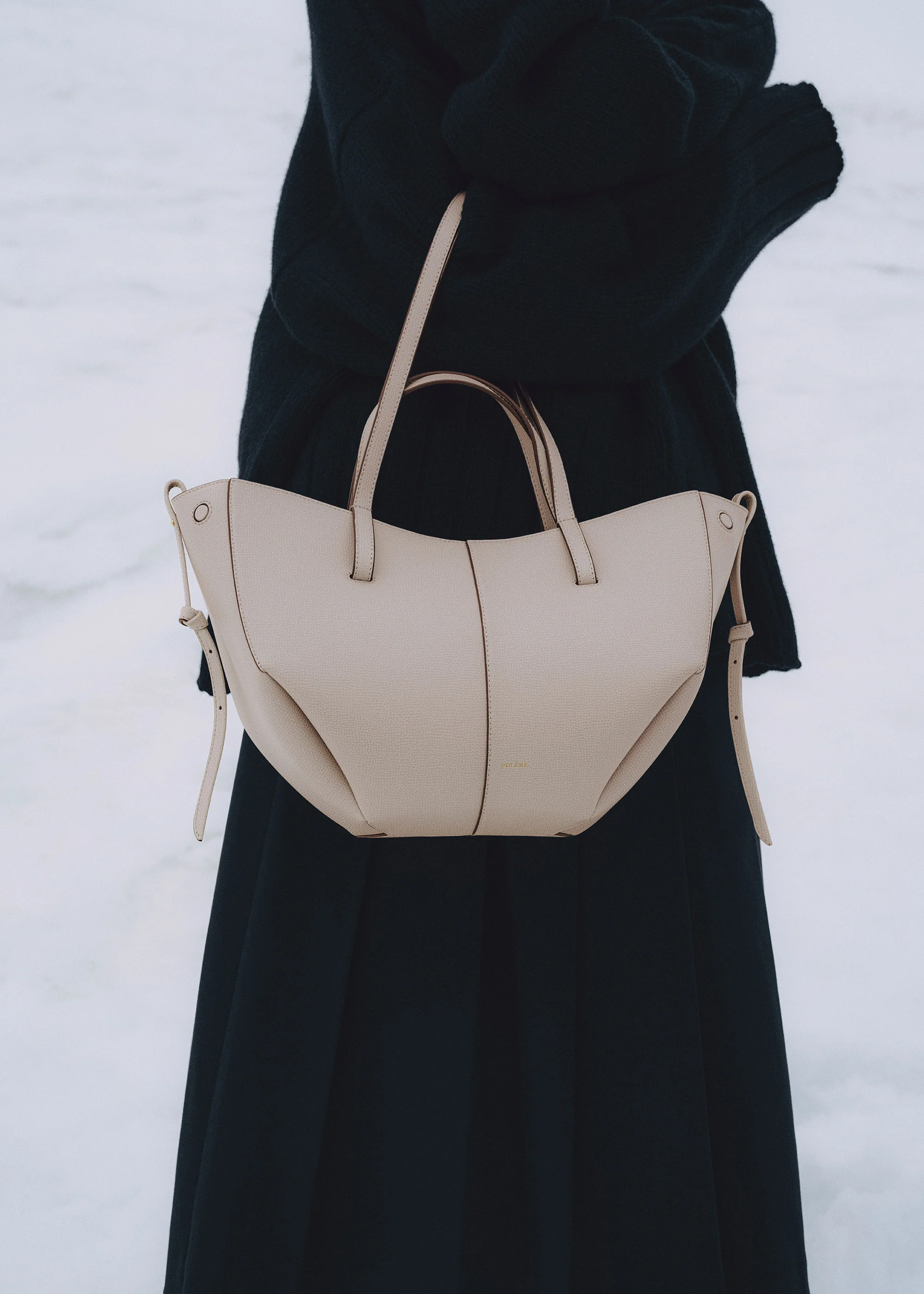This compact sculptured tote bag featuring waves, folds, and curves can be used in two ways. The first is a basket, its sides open, its straps on the outside. The second is a floral, closed bag, its sides tucked in, its straps crossing on the inside. Its name was inspired by the French word “cime”, meaning a peak or mountain crest, in reference to the ridge running along it.