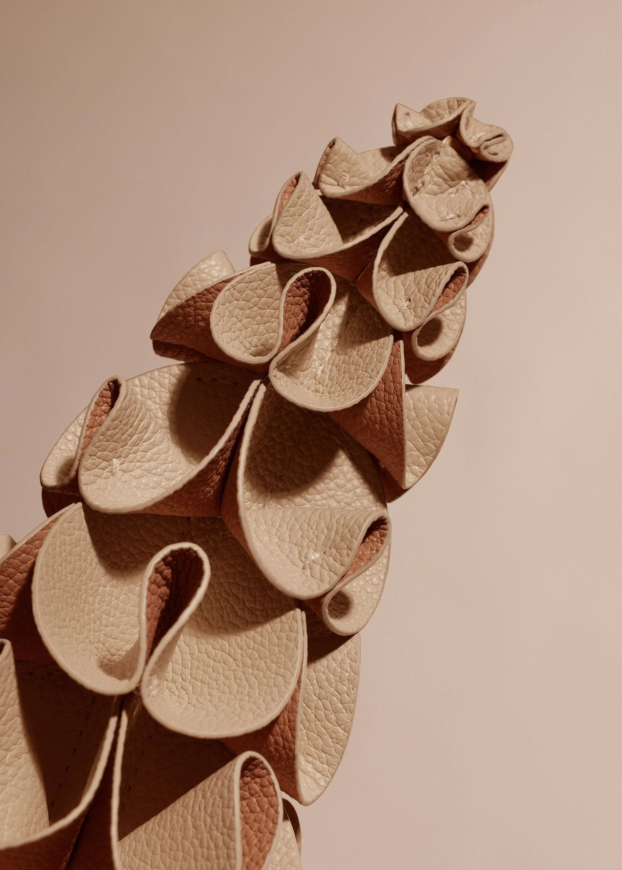 From the Plèi collection and made entirely from upcycled leather offcuts, the “Orki” flower is a dreamlike plant, reminiscent of wisteria with its eight-tiered conical shape and sloping stem. Its circular petals of decreasing size are made of two types of leather, folded and hand-sewn together, evoking the elegance of an orchid. A slender leaf is stitched along the leather-covered stem. This flower can be displayed in a bud vase, with other leather flowers, or in a bouquet of dried flowers. The name “Orki” is a play on the word “orchid”, echoing the flower which served as the inspiration for the petals in this piece.