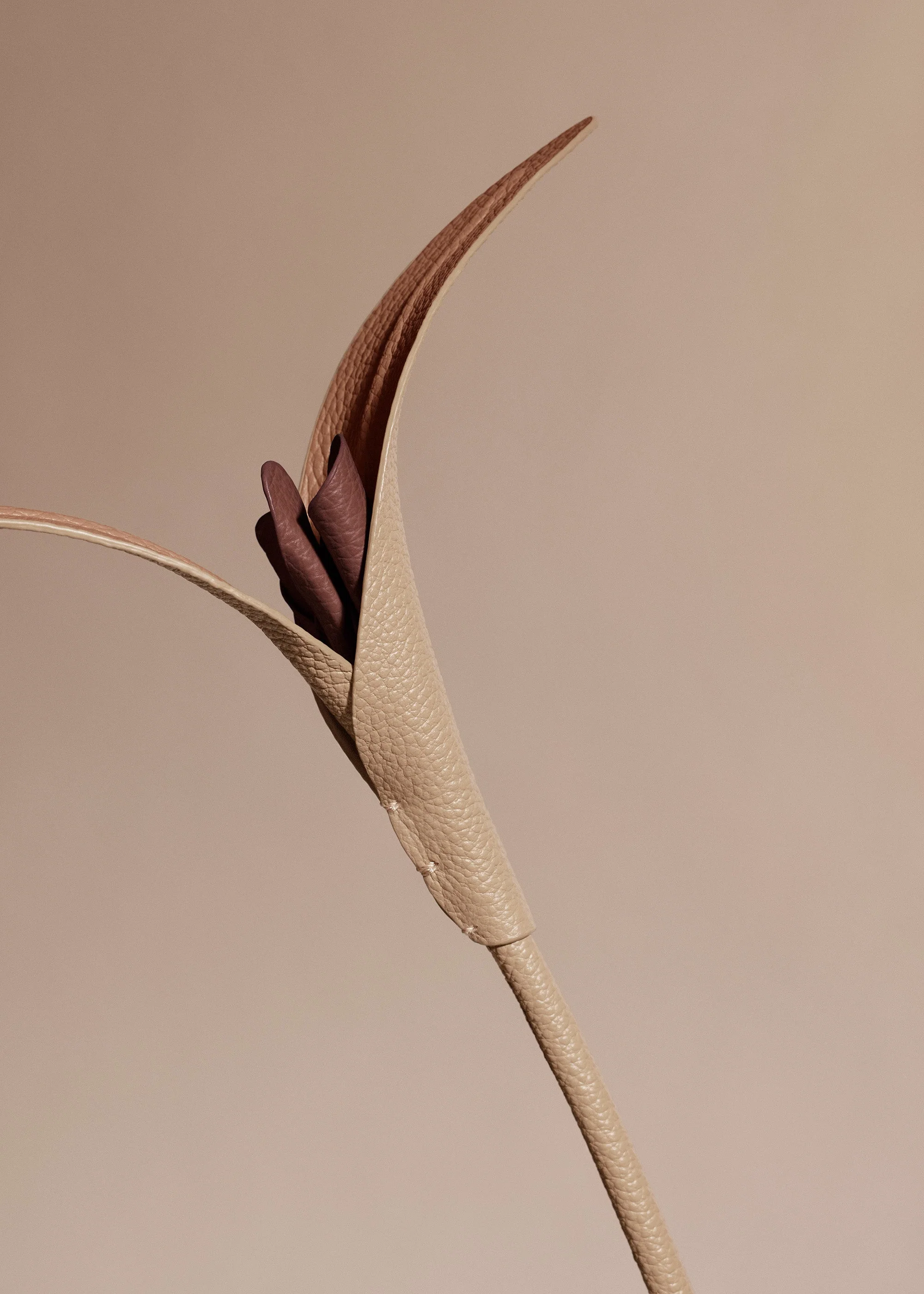 From the Plèi collection and made entirely from upcycled leather offcuts, the “Touka” flower is fashioned in three different hues of a single color. Its clean lines were inspired by the bird of paradise. Two asymmetric flowers have curled inner petals. Hand-stitched ribbed leaves subtly conceal the point where their leather-covered stems meet. This flower can be displayed in a bud vase, with other leather flowers, or in a bouquet of dried flowers. The name “Touka” is a play on the word “toucan”, echoing the bird of paradise flower which served as the inspiration for this piece.